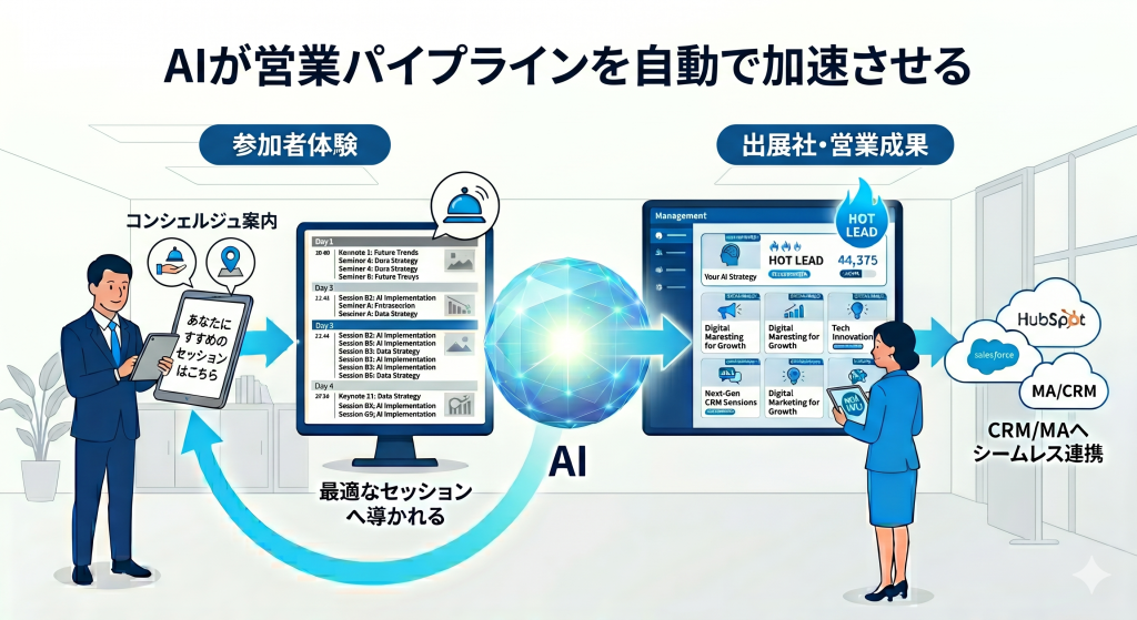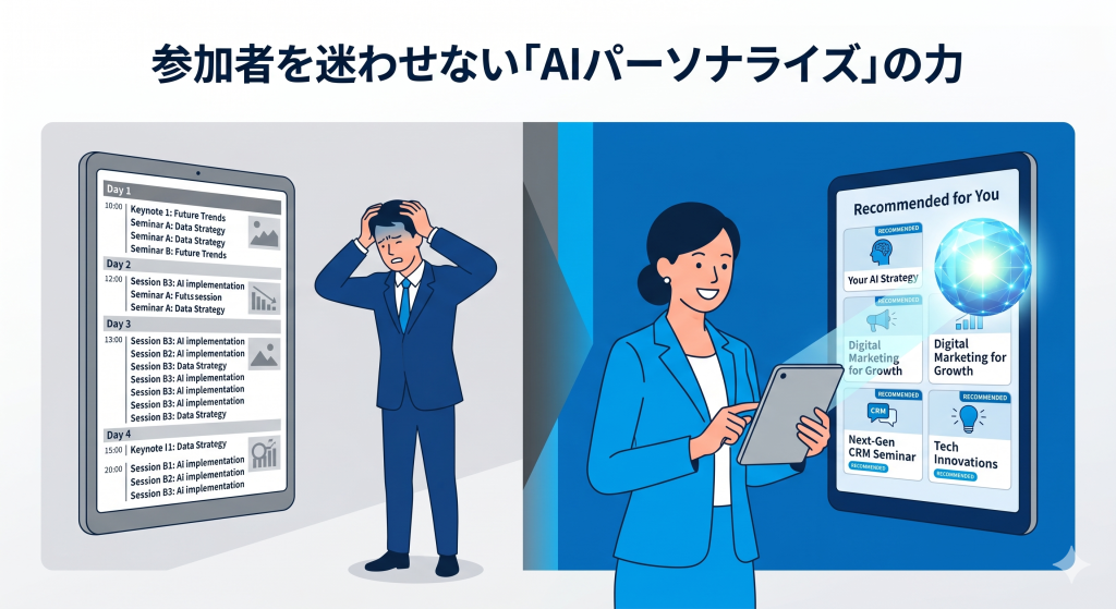 1. 情報過多の解消: 大規模イベントでは、AIによる「おすすめセッション・出展社のリコメンド」がないと、参加者は迷子になり離脱する。