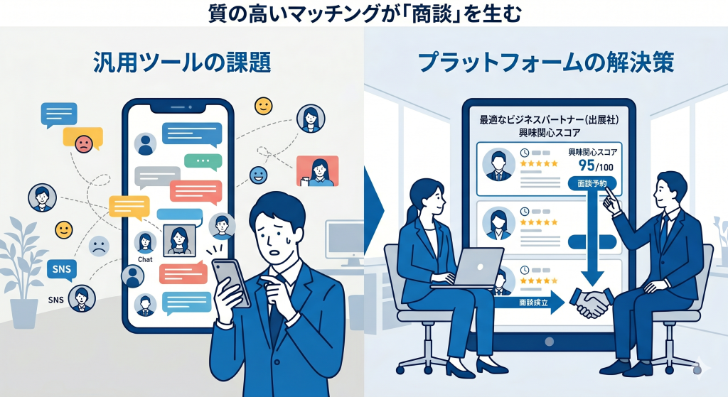 3. マッチングの質の違い: 汎用ツールの「SNS的な気軽な交流」ではなく、データに基づいた「商談直結型のAIマッチング」を提供するプラットフォームを選ぶべき。