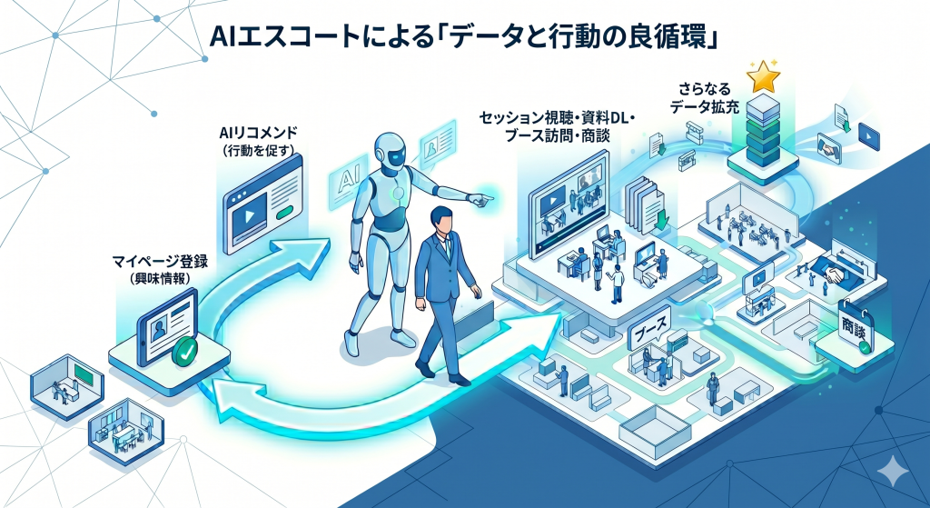 - AIリコメンドの価値: 参加者の行動ログ(インテントデータ)をAIが解析し、「次に見るべきセッション・行くべきブース」を自動提案することで、回遊率と商談化率が跳ね上がる。