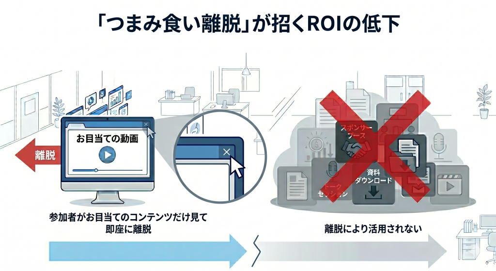 - ROI低下の真因: 手軽なツールでは参加者に「情報検索」を強いるため、目当てのセッションだけを見て離脱され、スポンサー(出展社)との接触機会が失われる。