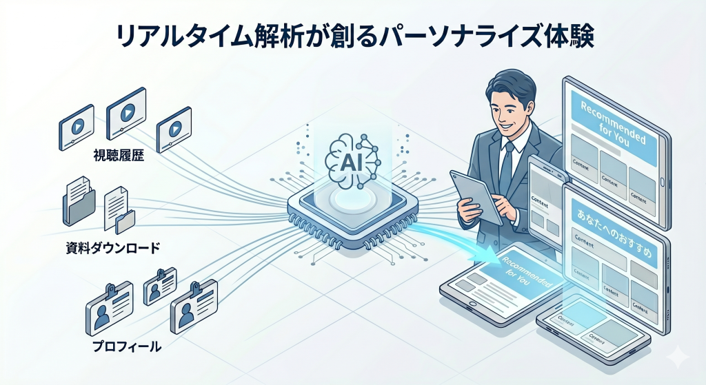AIは、参加者が登録時に入力した「業種・役職・抱えている課題」といった静的データに加え、イベント当日の「どのセッションを長く視聴したか」「どのスポンサーのPDF資料をダウンロードしたか」という動的な行動ログ(インテントデータ)をリアルタイムで解析します。